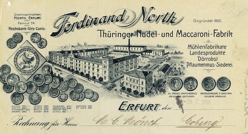 Rechnung der Thüringer Nudel- und Maccaroni-Fabrik Ferdinand North von 1905.