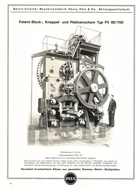 Mit Bildern wie diesen wartete der Pels-Katalog namens „Pressen Scheren Lochstanzen“ im Jahre 1928 auf.