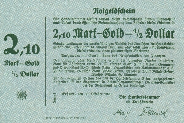 Notgeldschein 2,10 Mark Gold 1923 Rückseite